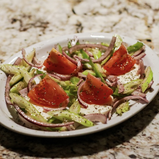 Seasonal peppers, red onions,cucumbers, celery, tomatoes over fresh mozzarella in our home made vinaigrette