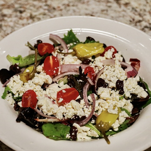 Mixed field greens, Gaeta olives, red onions, pepperoncini, cherry tomatoes, and feta cheese with our vinaigrette dressing