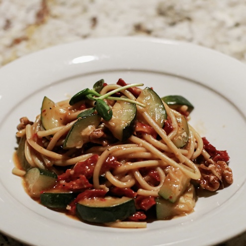 Bucatini pasta , zuchini,sun-dried tomatoes, and walnuts in garlic olive oil sauce