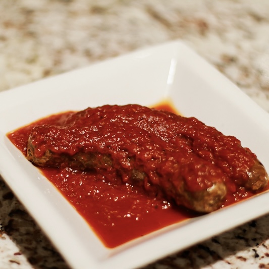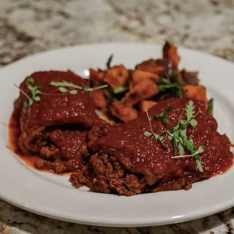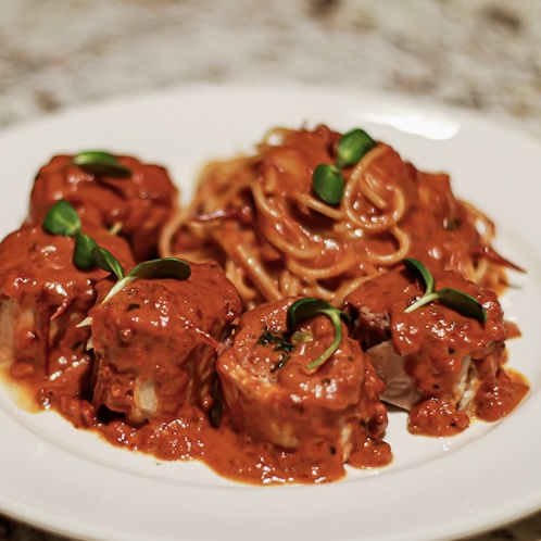 Battered and rolled eggplant filled with ground beef in our cherry tomato marinara sauce with a side of spaghetti