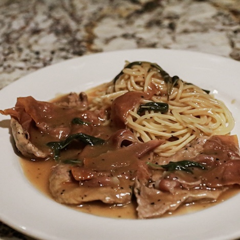 Veal scallopini topped wiht Prosciutto di Parma in a Sherry Marsala wine sauce