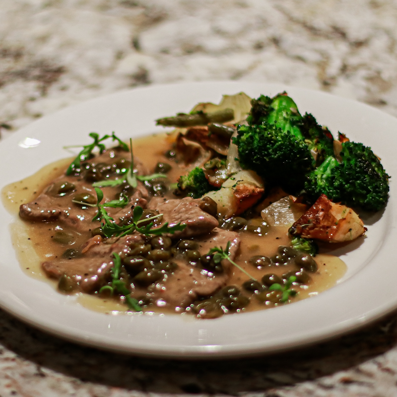 Veal scallopini with onions, capers and Sicilian oregano in our cherry tomato marinara sauce