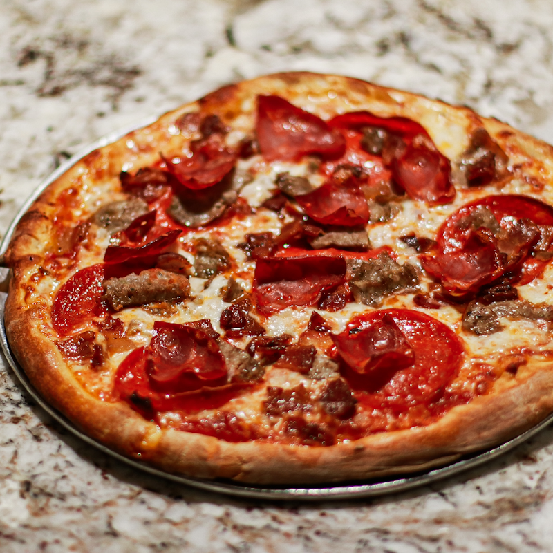 Deli Pepperoni,pancetta,caramelized onions,sausage,spinach,roasted garlic,tomatoes, fresh mozzarella