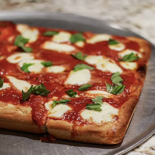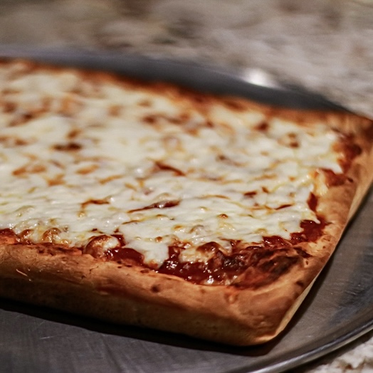 Pan baked with our roasted pizza sauce and mozzarella cheese