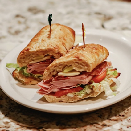 Ham, Genoa salami, prosciuttini, capicola, provolone cheese, lettuce, tomato, red onions, hot peppers, vinaigrette on a baguette