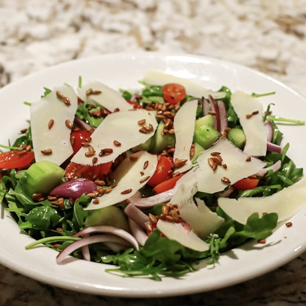 Arugala, red onions, cherry tomatoes, sunflower seeds and marinated mushrooms wiht our home made lemon extra virgin olive oil dressing