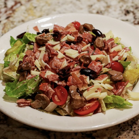 Romaine lettuce with Genoa salami,prosciutto, capicola, provolone, shaved parmigiano, cherry tomatoes,marinated mushrooms, black olives, pepperoncini with our house vinaigrette dressing