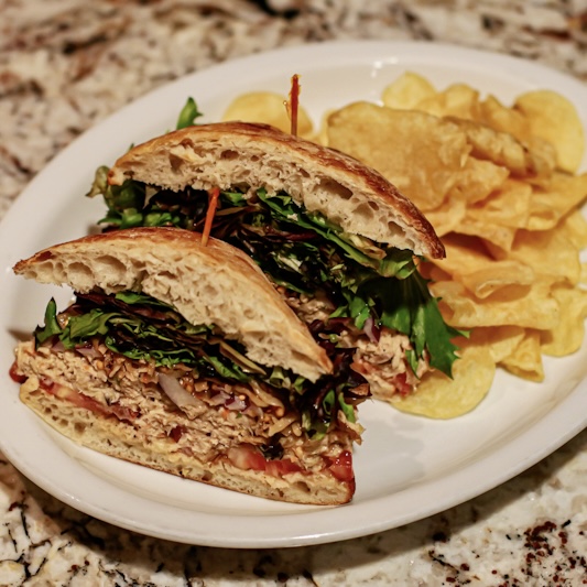 Tuna salad with olives, red onions, homemade eggplant giardinere, lettuce, tomato on ciabatta bread