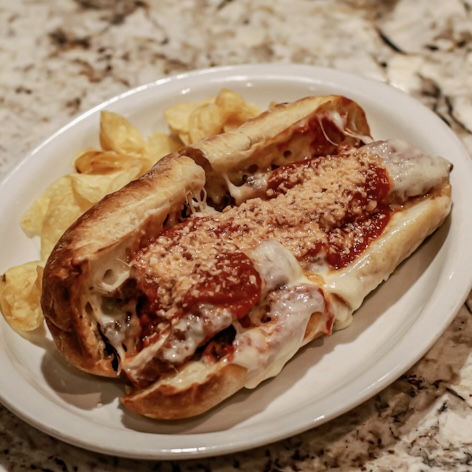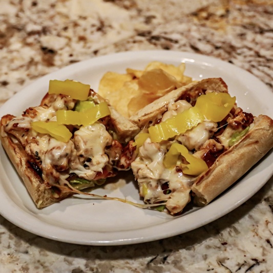Fresh grilled and marinated chicken with carmelized onions, lettuce, tomato, mayo, and hot peppers with mozarella cheese on a baguette