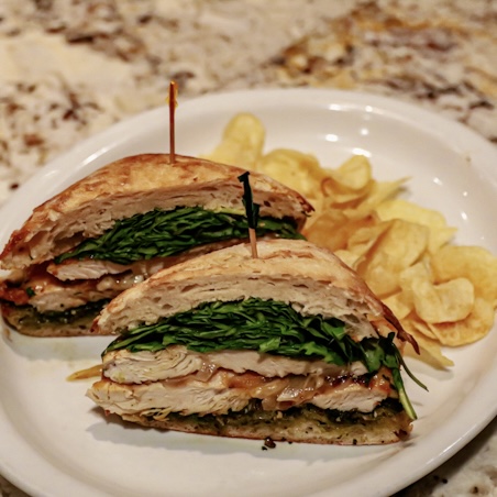 Pesto aiolo, caramelized onions,arugula topped with Asiago cheese on ciabatta