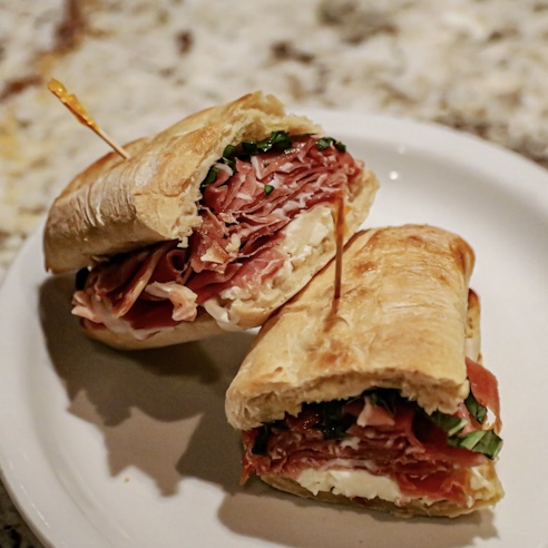 Prosciutto di Parma, homemade mozzarella, fresh basil, tomatoes, extra virgin olive oil on a baguette