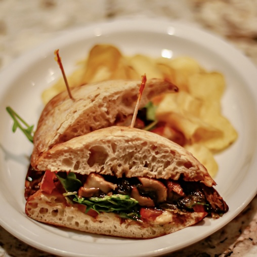 Portobello mushroom marinated in balsamic vinegar, carmelized onions, arugula, tomatoes, gorgonzola cheese on ciabatta bread