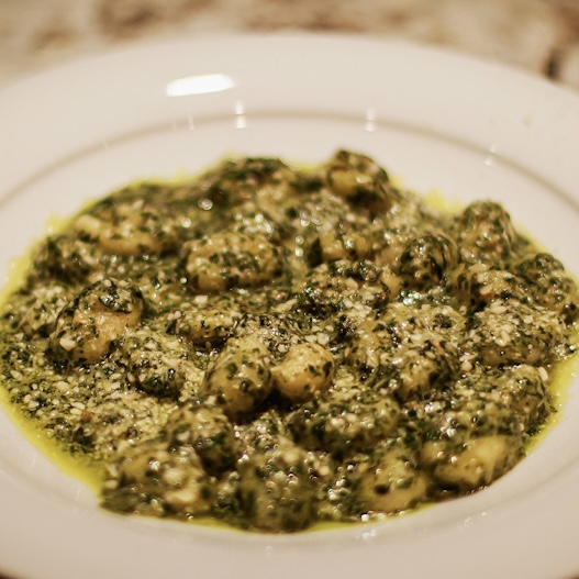 Potato gnocchi , green peas, and pancetta in our cherry tomato marinara