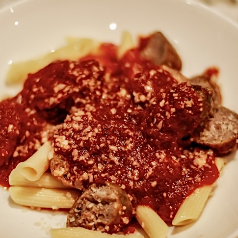 Penne pasta with sliced homemade sausage in marinara sauce with parmigiano cheese