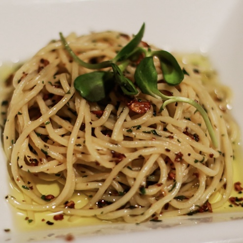 Spaghetti pasta with fresh garlic, extra virgin olive oil , sauteed in Italian spices