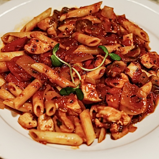 Chicken cooked with roasted red peppers, sauteed onions, wild mushrooms, in a rosemary marinara sauce with penne pasta