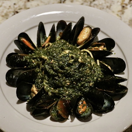 Mussels, clams, shrimp, scallops, and calamari in a marinara sauce over linguine