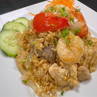 Fresh steamed jasmine rice a combo of chicken, pork, beef, and shrimp stir-fried with egg, tomatoes, white onions, scallions and cilantro