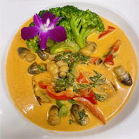 Char-grilled fresh boneless “sushi grade” salmon filet in a mild curry sauce with straw mushrooms fresh basil and red green bell peppers