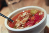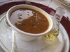 A tomato-based soup made with vegetables and lots of crab meat.