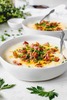 This scratch made recipe is the perfect definition of comfort food. Rich and creamy potato soup with sour cream, chives and bacon bits.