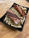 Shell pasta, folded in a velvety three cheese sauce blend, topped a perfectly marinated, slow cooked beef short rib and crunchy onion crisps.