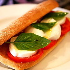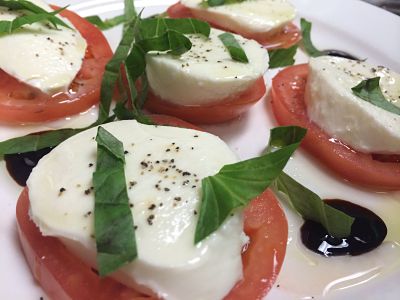 Slice of fresh mozzarella, slice of tomatoes, fresh basil, extra virgin olive oil & balsamic vinaigrette.