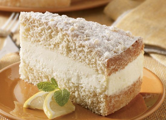 Refreshing lemon cream fills this delightful cake, topped with vanilla cake crumbs and a dusting of sugar.