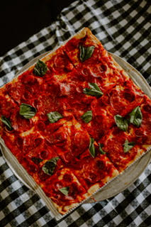 upside down style, Mozzarella blend, homemade marinara, charred cup pepperoni