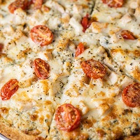 Rustic crust, garlic pesto, pizza sauce, grilled chicken, sliced tomato, basil and cheese, topped with balsamic drizzle
