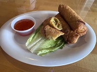 Four hand wrapped wontons filled with corned beef, Swiss cheese and sauerkraut, served with thousand island