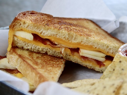 Thinly cut slices of apple with bacon and cheddar on country white.
